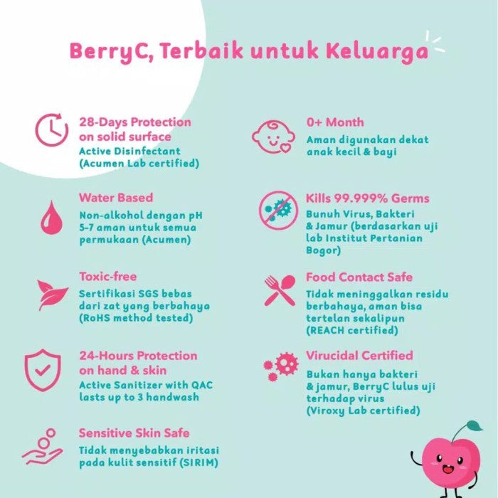 BerryC mengandung Quaternary Ammonium Compounds (QAC) generasi terbaru yang terbukti ampuh menurut National Environment Agency (NEA) of Singapore dan National Institute of Technology & Evaluation (NITE) dari Jepang untuk membunuh coronavirus & pathogen jahat tapi aman untuk manusia.