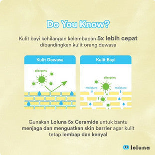 2-in 1 Sabun sampo mandi Loluna head-to-toe 5x Ceramide untuk membersihkan kulit & rambut bayi dan anak dengan lembut, menghidrasi dan menjaga skin barrier. Sabun dan shampo ini diperkaya dengan 5 jenis ceramide. Cocok digunakan sejak bayi baru lahir / newborn (umur 0+). Gunakan Loluna 2-in-1 Face & Body Lotion 5X Ceramide untuk perawatan setelah mandi.