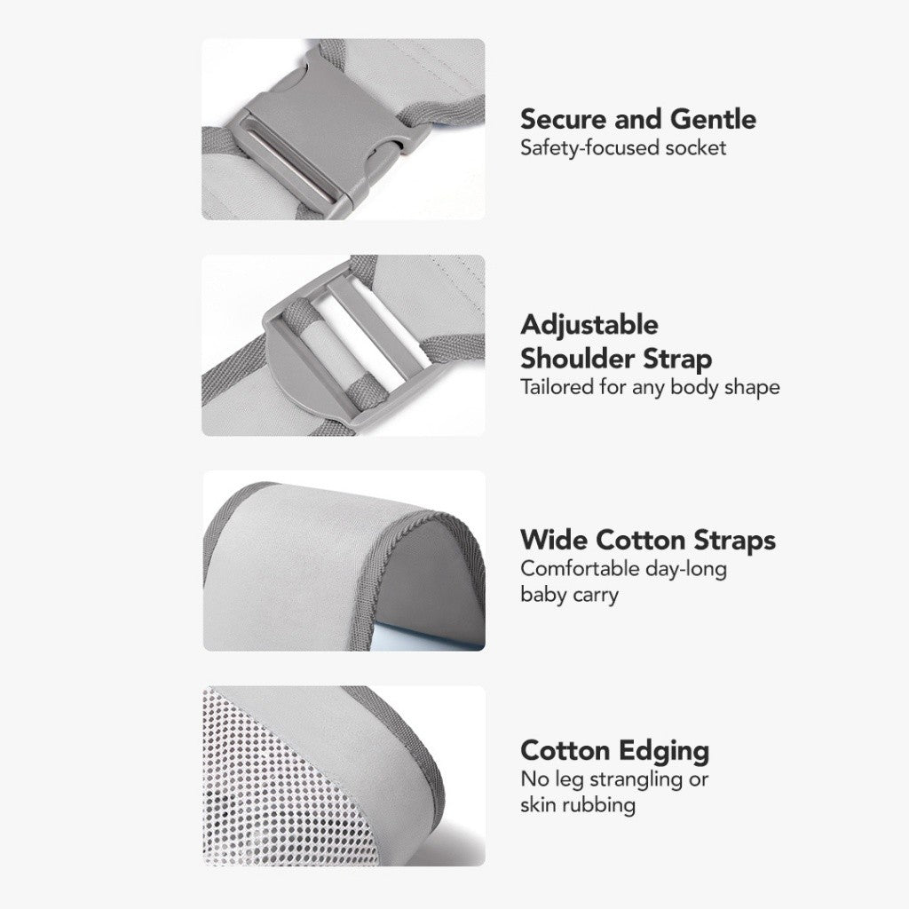 Desain ergonomis dengan membuat kaki bayi secara alami membentuk bentuk M saat duduk mengangkang, dan tekanan pada sendi pinggul kecil untuk mencegah kaki berbentuk O. Desain kain jaring 3D, sirkulasi udara menyeluruh 360°, penyerapan kelembapan yang cepat dan tidak panas.
