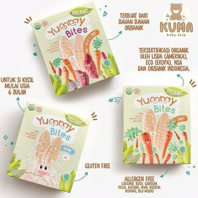 Yummy Bites ORGANIC Baby Rice Cracker Flavor adalah makanan/biskuit beras ringan untuk bayi berbentuk oval panjang untuk usia 6 bulan keatas. Yummy Bites dibuat dengan beras premium organik Japonica dan bahan sederhana lainnya, semua bahan-bahan alami . Produk ini juga bebas gluten , bebas telur dan bebas kacang, tanpa aditif buatan dan pengawet. Mengandung vitamin A , K ,E dan Protein sehingga baik untuk pertumbuhan si kecil. Biskuit ini sangat renyah namun setelah dimakan akan meleleh di mulut. Mudah digenggam oleh bayi yang baru belajar makan.