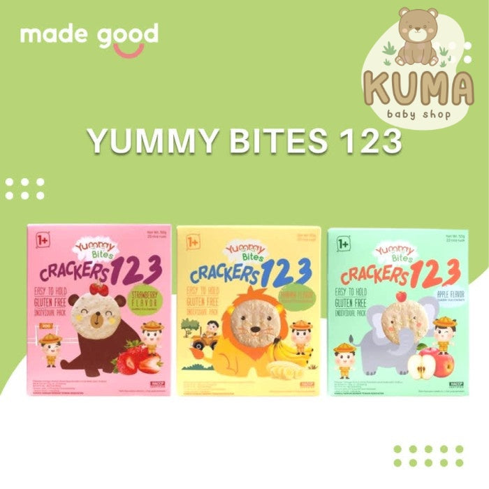 Yummy Bites 123 (rice cracker for toddler) adalah krakers beras yang terbuat dari beras Jepang organic berkualitas dan bahan alami lainnya. Produk ini juga bebas gluten , bebas telur dan bebas kacang, tanpa aditif buatan dan pengawet. Mengandung vitamin A , K ,E dan Protein sehingga baik untuk pertumbuhan si kecil, dengan tekstur yang lembut mudah meleleh di mulut dan aman ketika digigit, sehingga si kecil tidak akan tersedak serta mudah dicerna oleh tubuh. Cocok untuk Si Kecil yang mulai menginjak usia toddler 1+ tahun.